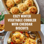 This Savory Winter Vegetable Cobbler combines hearty seasonal vegetables with a cheesy, herb-infused biscuit topping, baked to golden perfection. A comforting one-dish meal perfect for chilly days, featuring a rich vegetable filling simmered in a flavorful broth and hot sauce, topped with tender cheddar biscuits infused with fresh thyme.