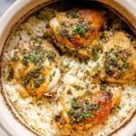You can prepare this dish in a covered oven-safe pot by baking at 350°F (175°C) for about 1 to 1 ½ hours, or until the chicken reaches 165°F internally and the rice is tender.