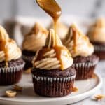 The image shows several small chocolate cupcakes arranged on a white plate placed on a white marbled surface. Each cupcake has two layers: the bottom dark brown chocolate cake base with a dense texture and the top layer of light tan creamy frosting swirled generously in a cone shape. A spoon held above the center cupcake is pouring thick golden caramel sauce that drips slowly over the frosting, adding shiny streaks and small drops. Scattered around the plate on the surface are whole peanuts, adding a crunchy element to the scene. The lighting highlights the glossy caramel and the soft texture of the frosting, making the cupcakes look rich and inviting. Photo taken with an iphone --ar 4:5 --v 7
