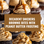Keywords: Snickers brownie bites, mini brownies, peanut butter frosting, caramel drizzle, bite-sized dessert, chocolate peanut butter snacks