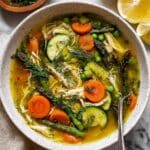 Keywords: spring vegetable soup, chicken soup, orzo soup, healthy soup, easy soup recipe, seasonal vegetables, light dinner