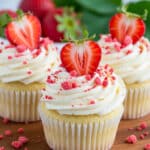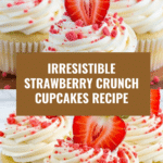 Delicious Strawberry Crunch Cupcakes featuring moist white cake cupcakes topped with creamy cream cheese frosting, a crunchy strawberry-flavored Oreo topping, and fresh strawberries for a burst of fruity flavor.
