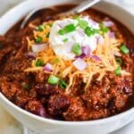 Store leftover chili in an airtight container in the refrigerator for up to 4 days. Reheat gently on the stovetop over medium-low heat, adding a splash of beef broth or water if needed to loosen the consistency. This chili also freezes well for up to 3 months; thaw overnight in the fridge before reheating.