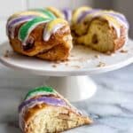 This recipe for the BEST Mardi Gras King Cake offers a classic, rich, and flavorful treat perfect for celebrating Mardi Gras. Made with a soft, yeasted dough filled with cinnamon, brown sugar, butter, and pecans, then topped with a sweet vanilla glaze, this traditional cake is as fun to make as it is to eat. The dough is tender and fluffy with a deliciously spiced filling, rolled and baked into a beautiful ring shape that captures the festive spirit of the holiday.