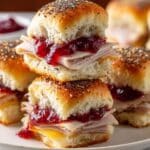 Delicious and easy Turkey Cranberry Sliders made with tender deli turkey, melted provolone or Swiss cheese, tangy cranberry sauce, and buttery seasoned Hawaiian rolls. Perfect for holiday gatherings or quick party snacks.