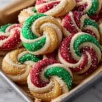 The image shows a tray filled with round swirl cookies, each made of three twisted dough strands forming a pinwheel shape. The dough strands come in cream color combined with either red and green, red and yellow, or green and yellow. Each swirl is coated with coarse sugar and small white nonpareil sprinkles, adding texture and sparkle. The cookies sit closely together on brown parchment paper inside a metal tray, placed on a white marbled surface. The festive red, green, and yellow colors create a bright, cheerful look. photo taken with an iphone --ar 4:5 --v 7