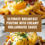 This Ultimate Breakfast Poutine combines crispy baked hash browns, savory beef bacon, melted cheddar and mozzarella cheeses, and rich gravy, all topped with perfectly poached eggs and a creamy, tangy homemade hollandaise sauce. Garnished with fresh herbs, this indulgent breakfast dish offers a decadent twist on traditional poutine that’s perfect for a weekend brunch or special morning treat.
