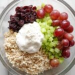 - Mix salad: Transfer the almond and chickpea mixture to a large bowl, then stir in diced celery, halved grapes, dried cherries, vegan mayo, lemon juice, and season with salt and pepper to taste.