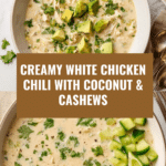 This White Chicken Chili is a creamy, flavorful soup made with shredded chicken, spices, and a smooth cashew-coconut cream base. It balances mild heat from green chilies and cayenne with fresh lime and cilantro, finished with creamy avocado slices for a comforting yet vibrant dish perfect for any season.